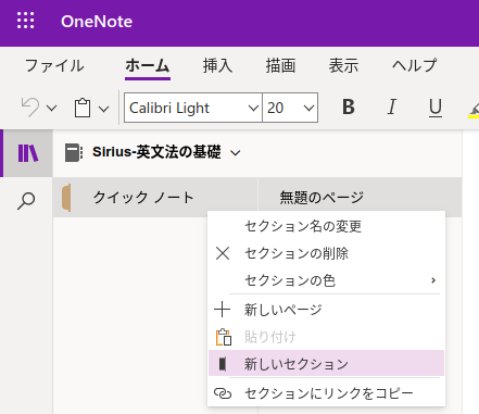 ノートブック名の下、左側のセクションのエリアで右クリック!